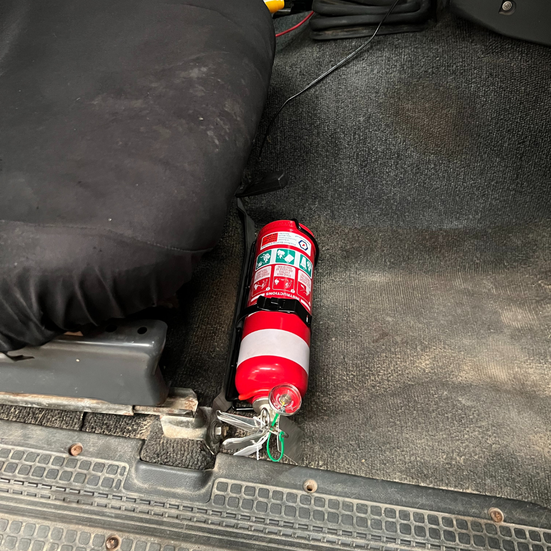 Securely mount a 1kg fire extinguisher on the passenger seat rails, without drilling any new holes!
