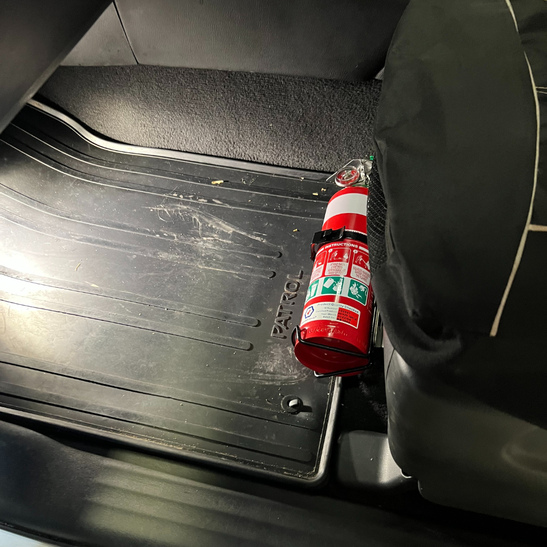 Securely mount a 1kg fire extinguisher on the passenger seat rails, without drilling any new holes!