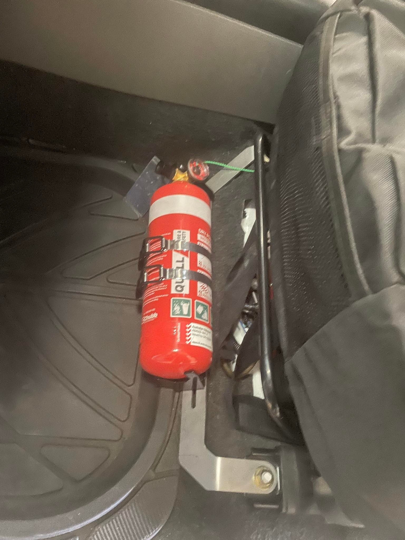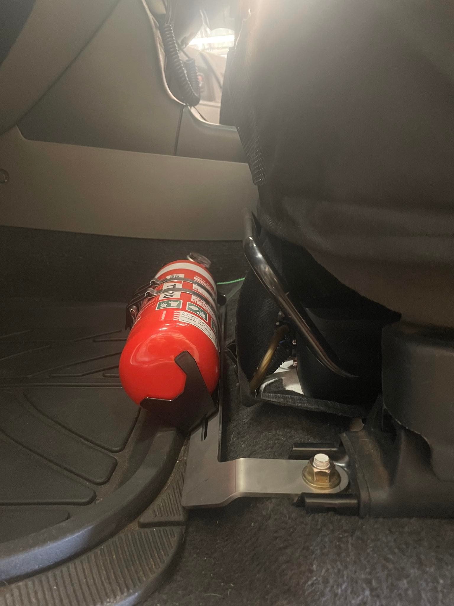Securely mount a 1kg fire extinguisher on the passenger seat rails, without drilling any new holes!