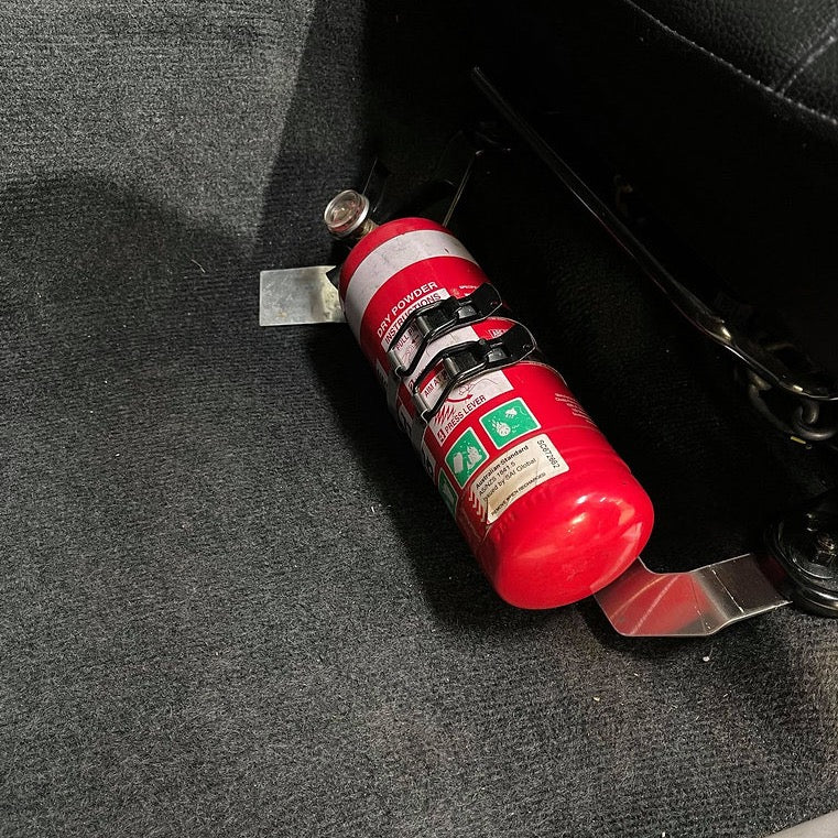 Securely mount a 1kg fire extinguisher on the passenger seat rails, without drilling any new holes!