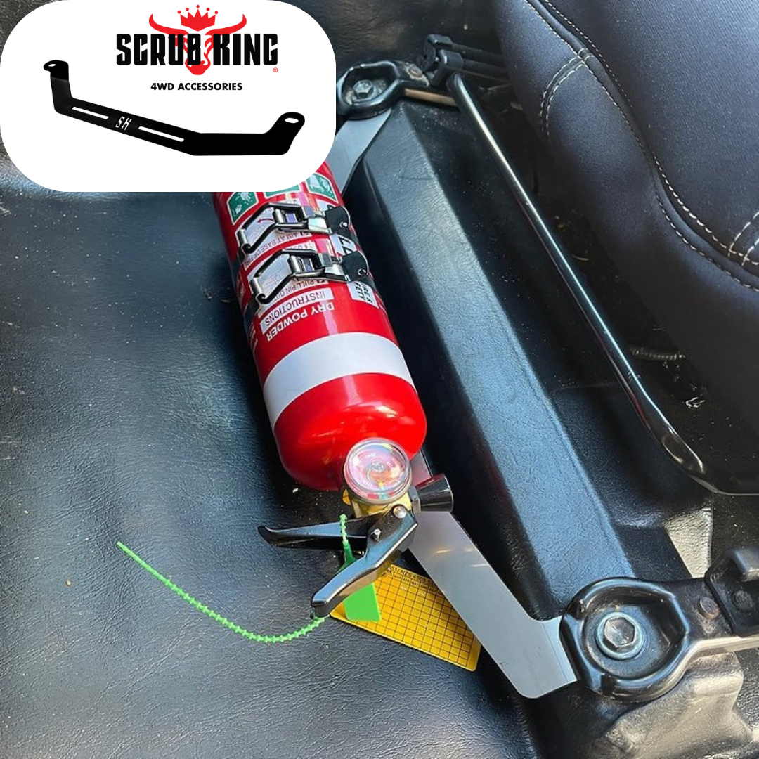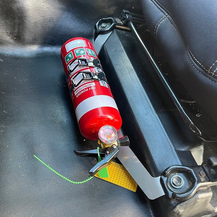 Securely mount a 1kg fire extinguisher on the passenger seat rails, without drilling any new holes!