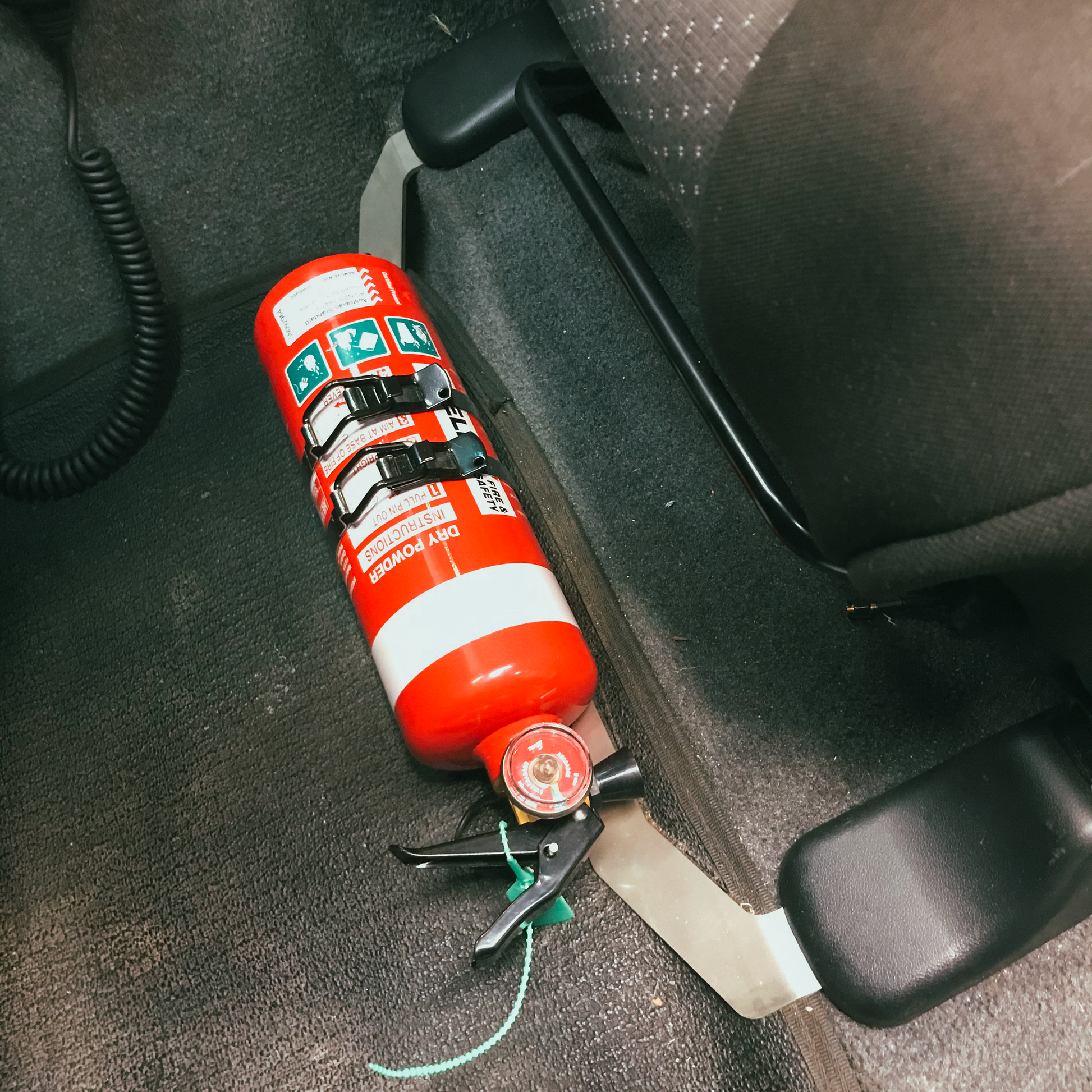 Securely mount a 1kg fire extinguisher on the passenger seat rails, without drilling any new holes!